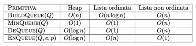 makePriorityQueue(Q'): restituisce una coda che memorizza le coppie(el, pr)in Q’isEmptyQueue(Q): ritornatruese la coda è vuotaenqueue(Q, el, pr): modifica la coda con inserimento coppiaminqueue(Q): ritorna l’elemento con priorità massima (valore minimo)decreasePriority(Q, el, pr): modifica la coppia(el, pr')in coda aggiornando la priorità dielal nuovo valorepr < pr'dequeue(Q): ritornaelcon la massima priorità e elimina la coppia dalla coda