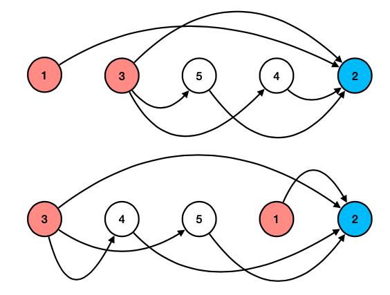 Nell’esempio corretto (quello di destra), il nodo 1 è un nodo sorgente, dal momento che non ha archi entranti, mentre il nodo 2 è un pozzo, perché non ha archi uscenti.