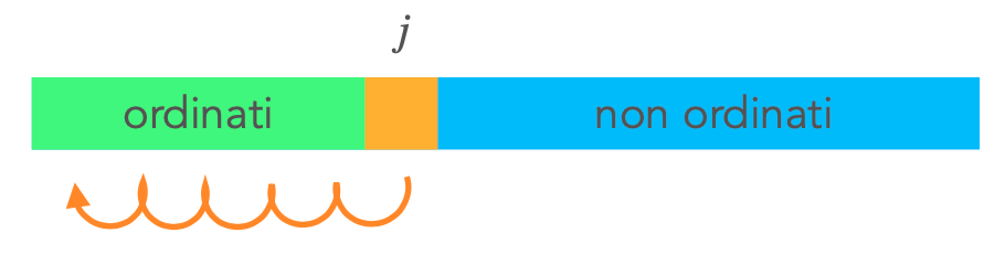 - si prende l’elemento successivo, e si valuta con quello precedente. Se quello nuovo è maggiore allora si lascia dove è, se invece è minore si scambiano