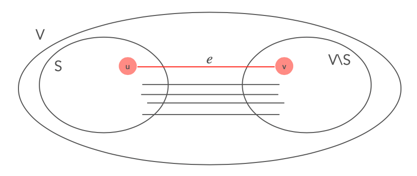 Dati un grafo $G=(V, E)$ e una funzione di costo $c: E \to R$ sugli archi, sia $S \subset V$ un sottoinsieme proprio e non vuoto di V ($0 \lt |S| \lt |V|$) e sia $e = (u, v) \in E$ un arco di costo minimo tale che $u \in S \mbox{ e } v\in V \setminus S$, allora l'arco $e$ appartiene a un MST per G.
