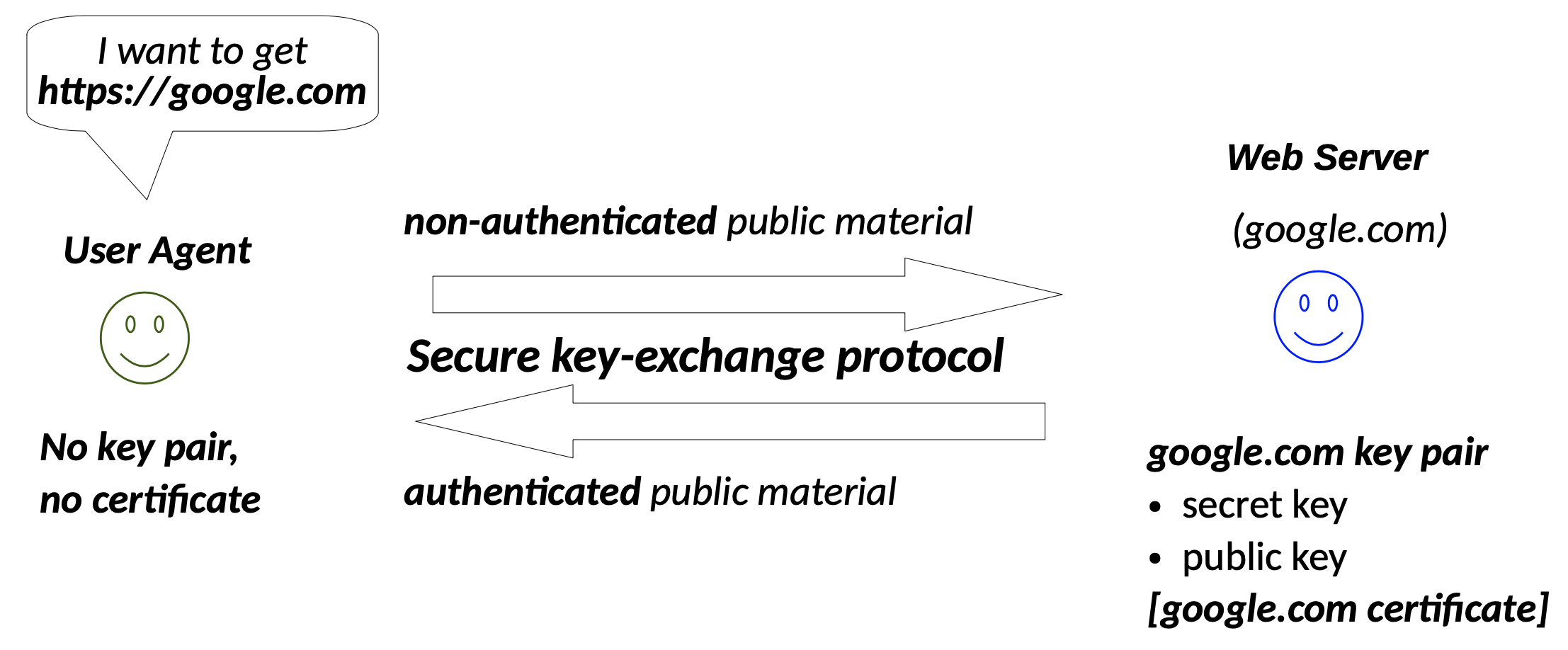 Nei browser, se c’è il lucchetto verde, si ha che è stato eseguito correttamente il protocollo di scambio di chiavi sicuro Diffie-Hellmann, e che si è riuscito ad autenticare il materiale crittografico inviato dal server, e che chi ha inviato il materiale è il dominio caricato. Anche il browser invia una chiave pubblica, ma non è autenticata.