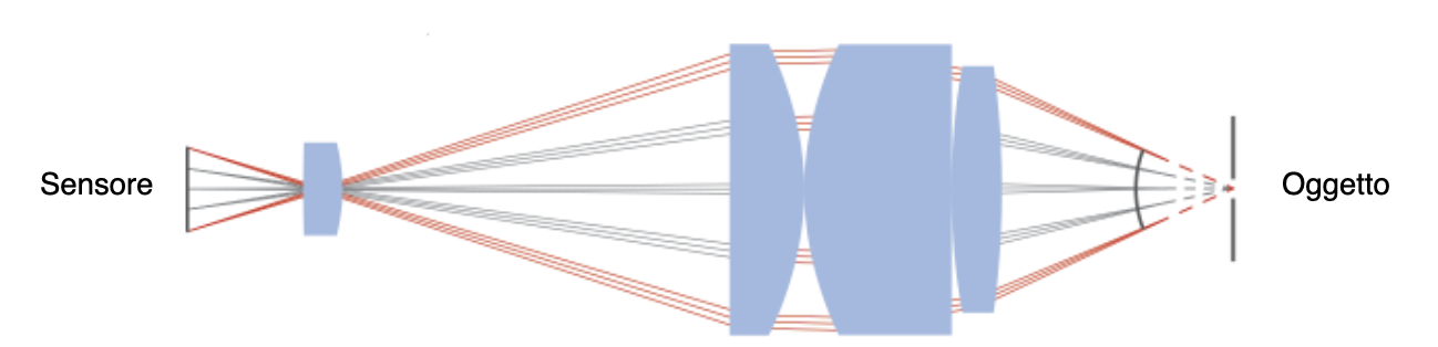 Lenti pericentriche. Se si posiziona l’oggetto al di la del punto di fuoco dei raggi, la lente si comporta come una normale lente entocentrica.