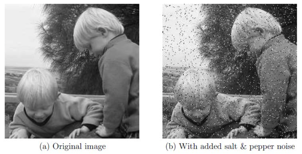 • Sale e pepe: pixel bianchi e neri sparpagliati in maniera randomica. Chiamato anche rumore impulso, rumore di scatto o rumore binario.