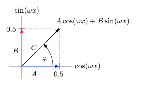 La somma di seno e coseno con stessa frequenza ma diversa ampiezza crea un nuovo sinusoide.